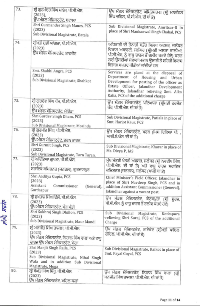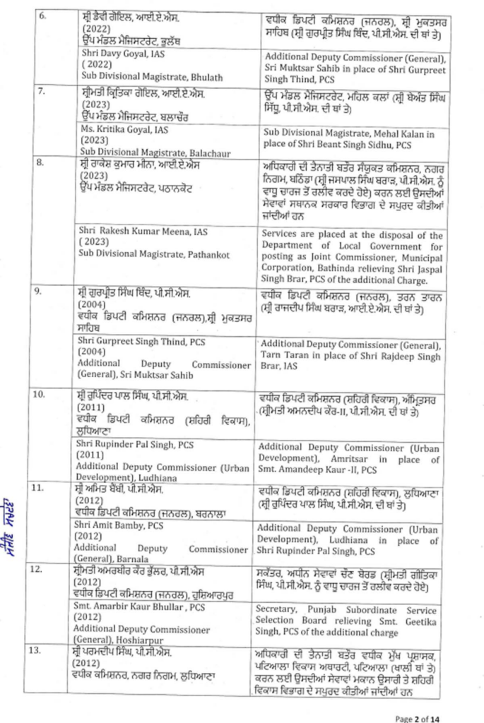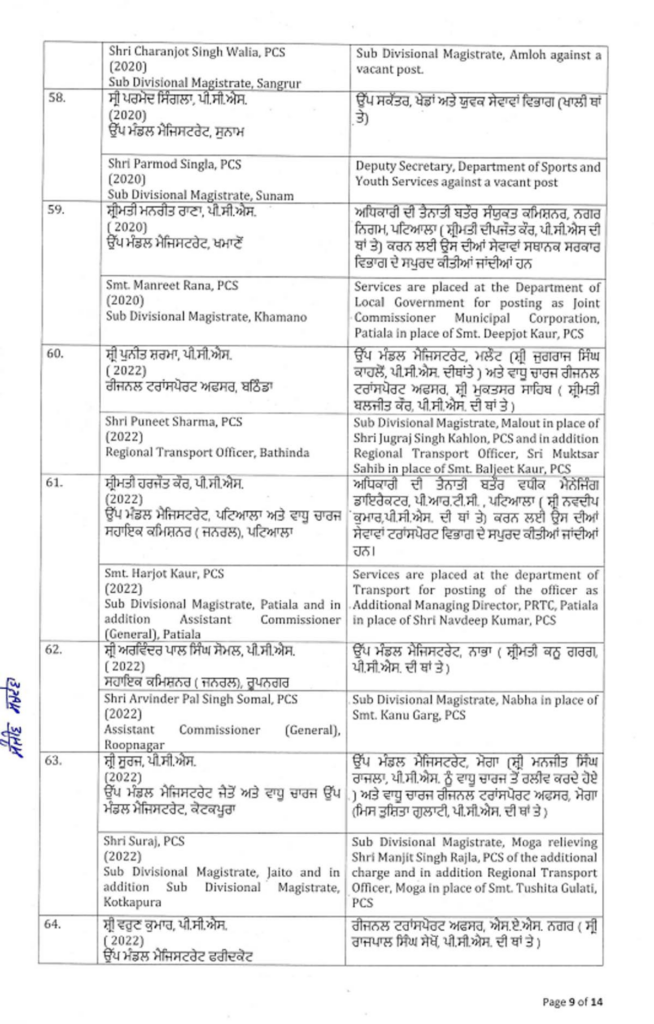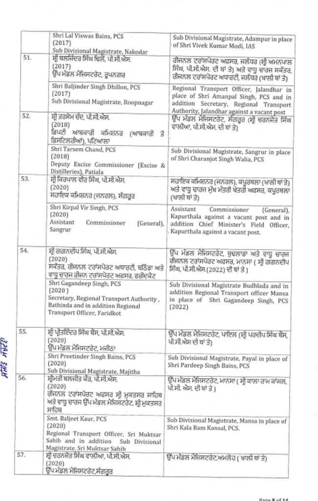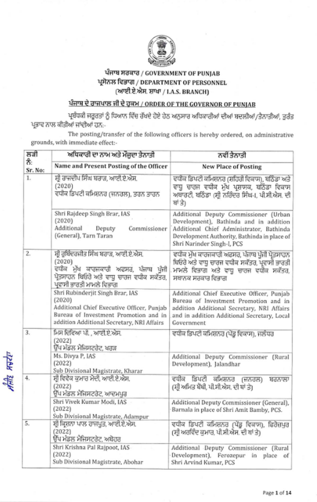 ਪੰਜਾਬ ਸਰਕਾਰ ਨੇ ਇੱਕ ਵੱਡਾ ਪ੍ਰਸ਼ਾਸਕੀ ਫੇਰਬਦਲ ਕੀਤਾ ਹੈ, ਜਿਸ ਵਿੱਚ ਅੱਠ ਆਈਏਐਸ ਅਤੇ 88 ਪੀਸੀਐਸ ਅਧਿਕਾਰੀਆਂ ਦੇ ਤਬਾਦਲੇ ਕੀਤੇ ਗਏ ਹਨ। ਸੂਚੀ ਹੇਠਾਂ ਦਿੱਤੀ ਗਈ ਹੈ…
