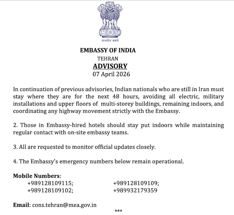 ਭਾਰਤੀਆਂ ਨੂੰ ਘਰਾਂ ਦੇ ਅੰਦਰ ਰਹਿਣ ਦੀ ਸਲਾਹ ਦਿੱਤੀ ਗਈ ਹੈ। ਪਾਵਰ ਪਲਾਂਟਾਂ, ਫੌਜੀ ਟਿਕਾਣਿਆਂ ਅਤੇ ਬਹੁ-ਮੰਜ਼ਿਲਾ ਇਮਾਰਤਾਂ ਦੀਆਂ ਉੱਪਰਲੀਆਂ ਮੰਜ਼ਿਲਾਂ ਤੋਂ ਦੂਰ ਰਹਿਣ ਲਈ ਕਿਹਾ ਗਿਆ ਹੈ। ਜੋ ਲੋਕ ਦੂਤਾਵਾਸ ਵੱਲੋਂ ਬੁੱਕ ਕੀਤੇ ਹੋਟਲਾਂ ਵਿੱਚ ਹਨ, ਉਨ੍ਹਾਂ ਨੂੰ ਦੂਤਾਵਾਸ ਦੀਆਂ ਟੀਮਾਂ ਨਾਲ ਲਗਾਤਾਰ ਸੰਪਰਕ ਬਣਾਈ ਰੱਖਣ ਲਈ ਕਿਹਾ ਗਿਆ ਹੈ। ਹੈਲਪਲਾਈਨ ਨੰਬਰ ਵੀ ਜਾਰੀ ਕੀਤੇ ਗਏ ਹਨ