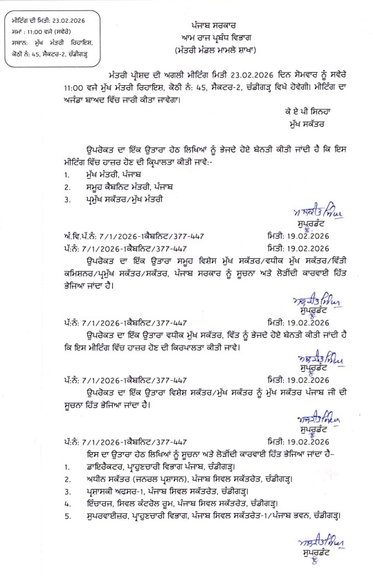 ਪੰਜਾਬ ਦੇ ਮੁੱਖ ਮੰਤਰੀ ਭਗਵੰਤ ਸਿੰਘ ਮਾਨ ਨੇ 23 ਫਰਵਰੀ ਨੂੰ ਪੰਜਾਬ ਕੈਬਨਿਟ ਦੀ ਮੀਟਿੰਗ ਸੱਦੀ ਹੈ। ਇਹ ਮੀਟਿੰਗ ਮੁੱਖ ਮੰਤਰੀ ਦੀ ਅਗਵਾਈ ਹੇਠ ਮੁੱਖ ਮੰਤਰੀ ਨਿਵਾਸ ਸਥਾਨ, ਸੈਕਟਰ-2 ਚੰਡੀਗੜ੍ਹ ਵਿਖੇ ਸਵੇਰੇ 11 ਵਜੇ ਹੋਵੇਗੀ। ਇਸ ਮੀਟਿੰਗ ਦੌਰਾਨ, ਸੂਬੇ ਨਾਲ ਸਬੰਧਤ ਕਈ ਵੱਡੇ ਅਤੇ ਮਹੱਤਵਪੂਰਨ ਮੁੱਦਿਆਂ ‘ਤੇ ਚਰਚਾ ਕੀਤੀ ਜਾਵੇਗੀ ਅਤੇ ਫੈਸਲੇ ਲਏ ਜਾਣ ਦੀ ਸੰਭਾਵਨਾ ਹੈ।